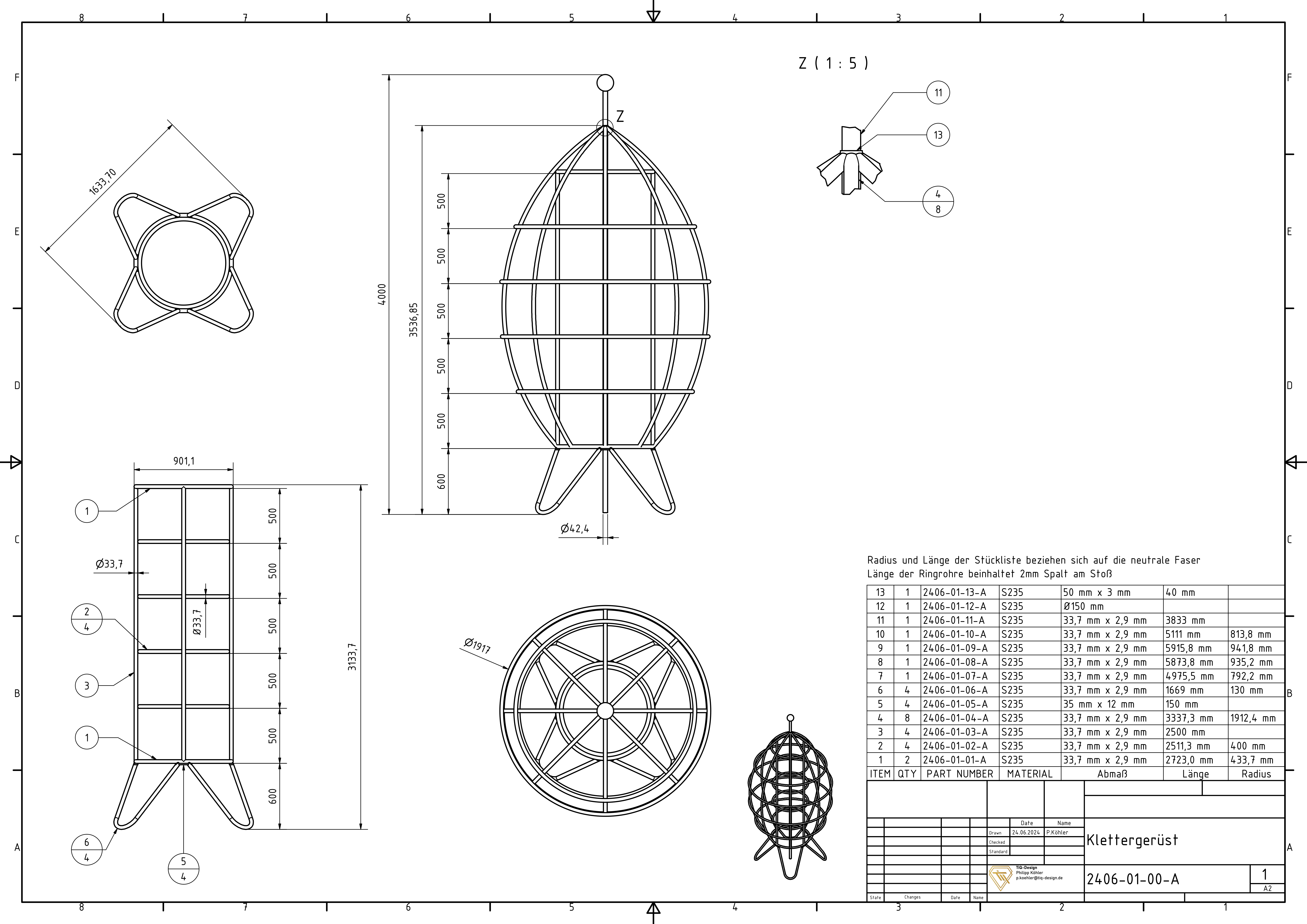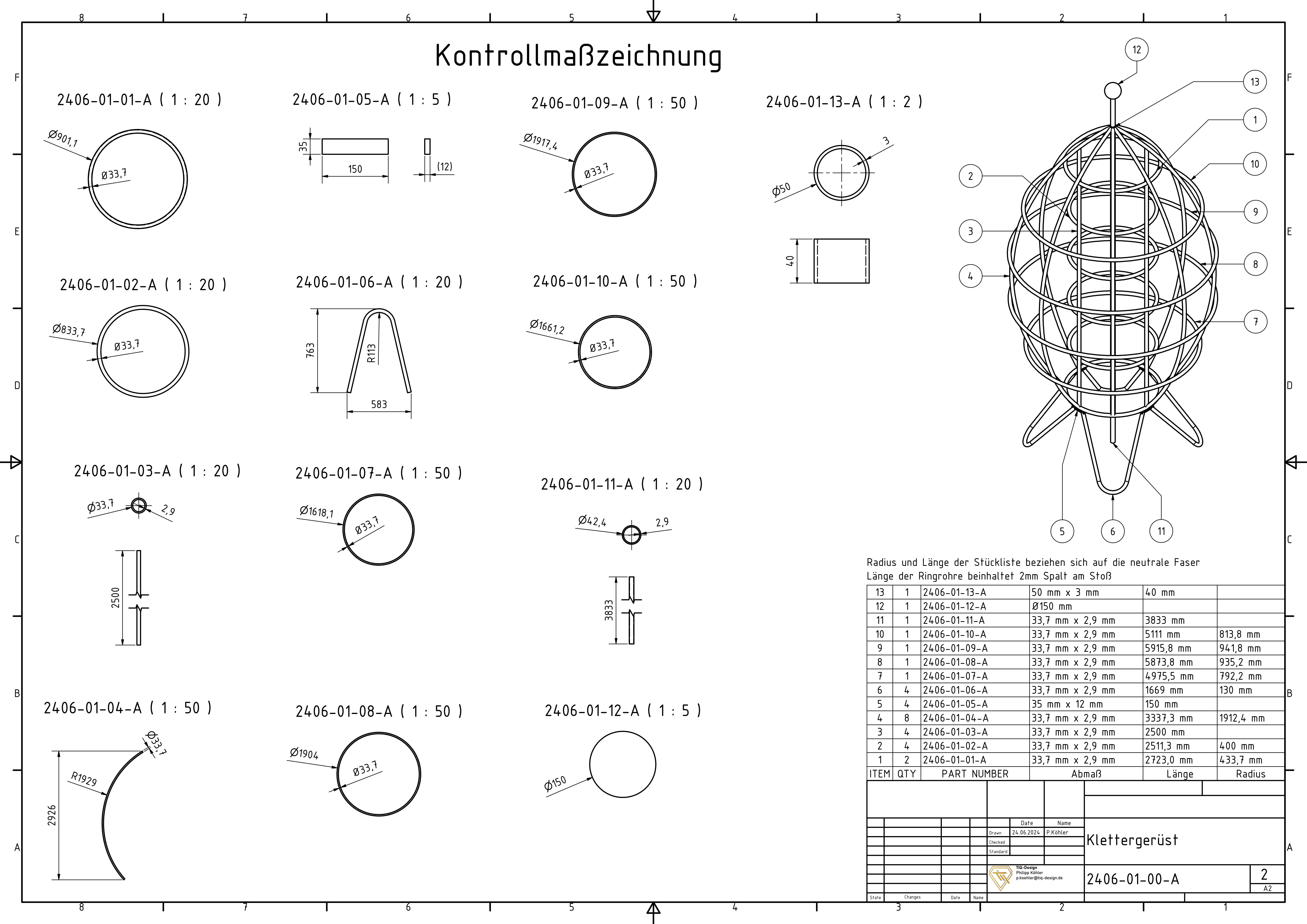 Auf Basis einer einfachen Skizze und Fotos eines bestehenden Klettergerüsts habe ich für einen Kunden eine technische Zeichnung erstellt, die als Grundlage für den Bau eines leicht modifizierten Gerüsts diente. Ziel war es, eine stabile, kindgerechte Konstruktion zu entwickeln, die sich mit den vorhandenen Mitteln realisieren lässt. Der Kunde, selbständiger Schlosser, hat das Klettergerüst eigenständig gefertigt. Eine detaillierte Konstruktion war dabei zweitrangig. Im Vordergrund standen vielmehr die Abmessungen der Einzelkomponenten sowie die Positionen dieser. Anpassungen an Verbindungsstellen sowie Schweißnahtvorbereitung und -verfahren hat er nach eigenem Ermessen während der Montage vorgenommen.
